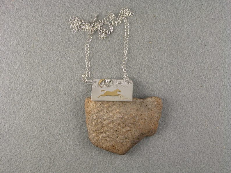 MW3045 Brass horse leaping across "hills" on sterling pendant with sterling sawdust and ball sky accents on sterling chain with sterling toggle clasp