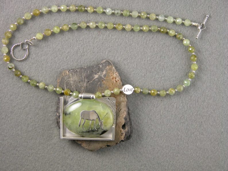 MW4184 Sterling grazing horse on prehnite stone set in sterling on necklace of green garnet beads with sterling heart accent beads and sterling heart-accented toggle clasp
