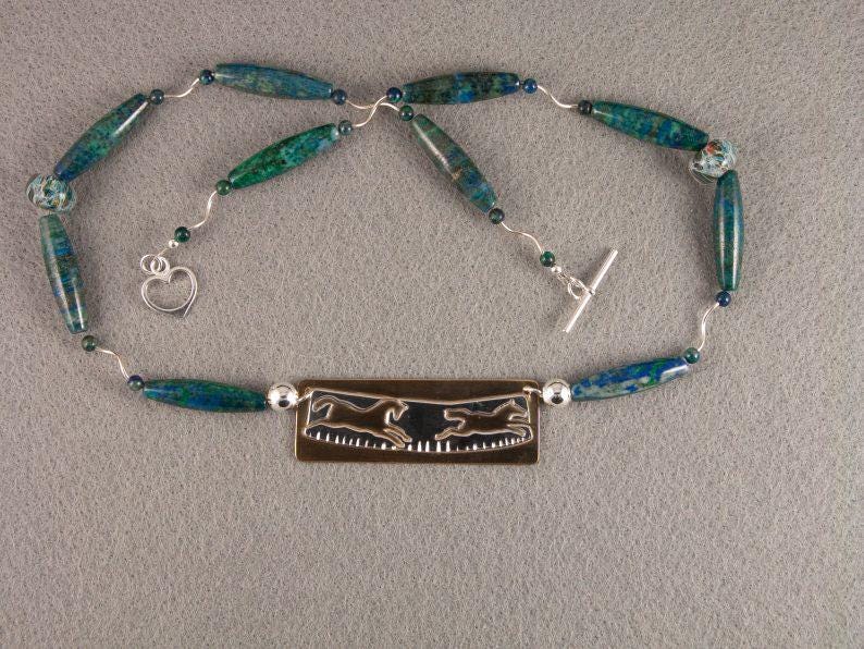 MW2230 Two sterling cut-out running horses on brass with grass accent on necklace of azurite/malachite beads with two lampwork dichroic accent beads and sterling S-tube spacers with sterling heart toggle