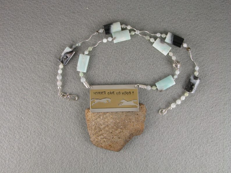 MW2468 Two cut-out brass galloping horses with stamped phrase “Horses Give Us Wings” on sterling pendant on necklace of Amazonite and aquamarine beads with sterling S-tubes and sterling accent bead with sterling S-hook clasp